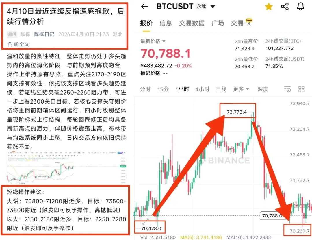 大家好我是你们的老朋友陈栋,我们先回顾一下今日的行情:日内盘面整体呈现宽幅震荡格局,凌晨阶段市场率先出现阶段性回调,比特币自71400关口回落至70400区域,短线回撤幅度近千点,以太坊同步跟随下行,由2220一线回落至2180附近,调整幅度逾40点;早盘时段多头逐步发力收复部分失地,比特币自70500附近反弹至71300一线,短线反弹幅度超800点,以太坊同步上行至2200关口附近,反弹幅度约20点;进入午盘后市场再度转向震荡下行,比特币从71300位置回落至70500区域,回调幅度近800点,以太坊同步承压下行至2170附近,调整幅度约30点。