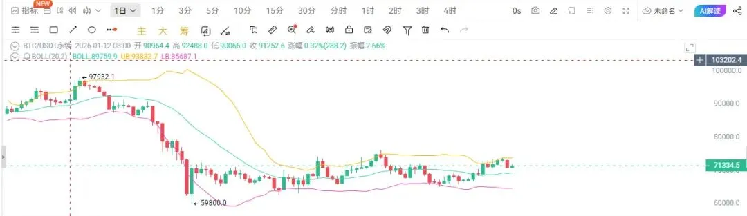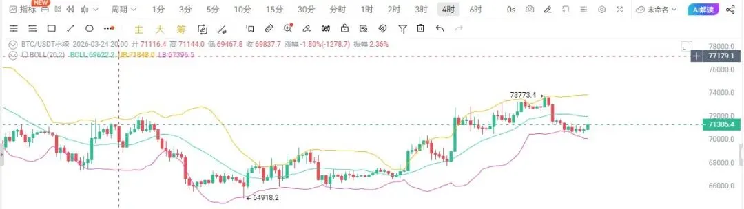 从四小时周期结构观察,BTC近期始终依托70500-70800区间支撑反复向上试探,上方则在73500-74000强压带出现明显承压回落,下方若支撑失守则进一步看向69000-68000区间,若支撑企稳则反弹目标仍看72000-74000区域,当前价格运行于布林带下轨与60日均线上方,布林带呈开口态势,短期均线拐头向下,MACD双线同步向下发散且空头量能持续缩减,KDJ指标于超卖区域附近获得支撑并出现拐头向上信号,VR指标维持在80水平位附近窄幅整理,整体盘面在73700一线承压后进入回撤修正阶段,中期思路保持不变,下方关键支撑集中于70000-69000区间,只要该区域不出现有效破位,调整结束后仍有望再度向上试探,上方核心压制位于周线中轨位置,该区域同样具备较高的高空布局价值,可耐心等待信号确认再行入场。