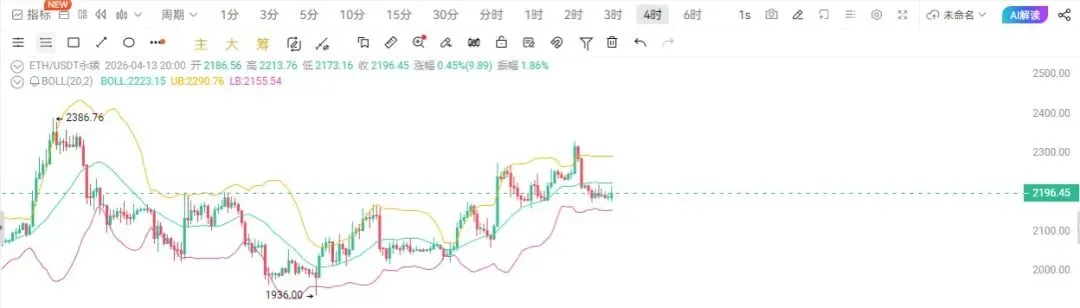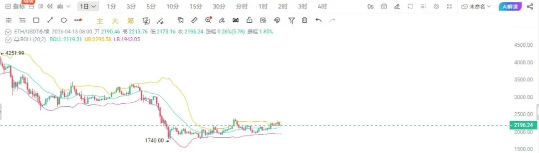 以太昨日K线收出实体阴线,收盘价回落至2184.93一线,2200整数关口再度失守,前期自低位反弹形成的上行节奏遭遇阶段性打断,当前价格在2170-2220区间内展开窄幅博弈。技术指标层面,布林带整体呈现缩口走平态势,价格贴近布林带中轨运行且有向下试探迹象,反映短期多头承接力度不足,震荡格局特征显著;均线系统中,短期均线拐头向下并形成弱势排列,价格跌破短期均线支撑后围绕均线带反复震荡,中期均线虽未形成明确压制,但上行斜率趋缓,暗示市场动能有所衰减 。MACD指标快慢双线在零轴上方呈现死叉向下趋势,绿色动能柱小幅放量,表明空头情绪暂时占据上风,多头反弹动能持续衰减;KDJ指标于中轴附近向下发散,未触及超卖区域,意味着短期下行风险仍存,需密切关注50数值分水岭附近的动能转化;VR指标维持在80水平位附近窄幅整理,交投情绪相对平稳但缺乏明确方向指引,资金暂未出现大规模进出动作 。结合K线结构与多周期信号来看,以太坊当前上方核心压力区集中于2210-2220区间,该区域对应布林带中轨与前期震荡平台上沿,阻力效应明显,一旦反弹无法有效突破,大概率延续区间震荡或进一步下探;下方关键支撑区间锁定于2170-2180区域,此处为布林带下轨附近与短期情绪支撑位,若该区域未能形成有效企稳,后续将进一步看向2140-2150区间支撑,反之若支撑有效,则有望围绕2200关口展开震荡修复 。