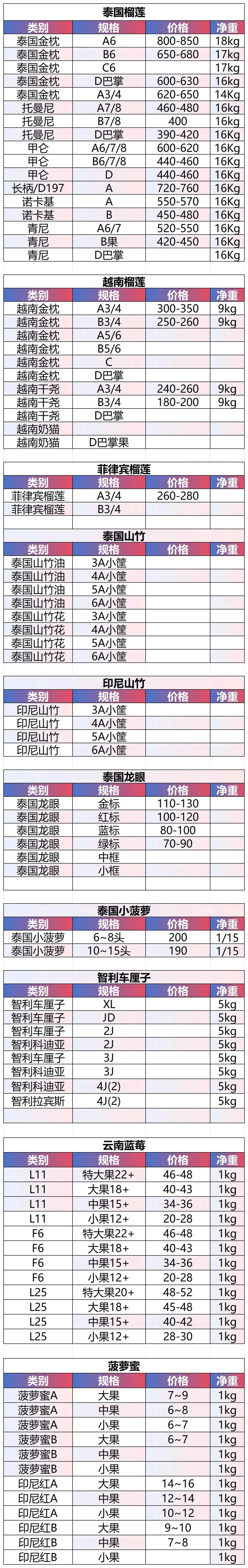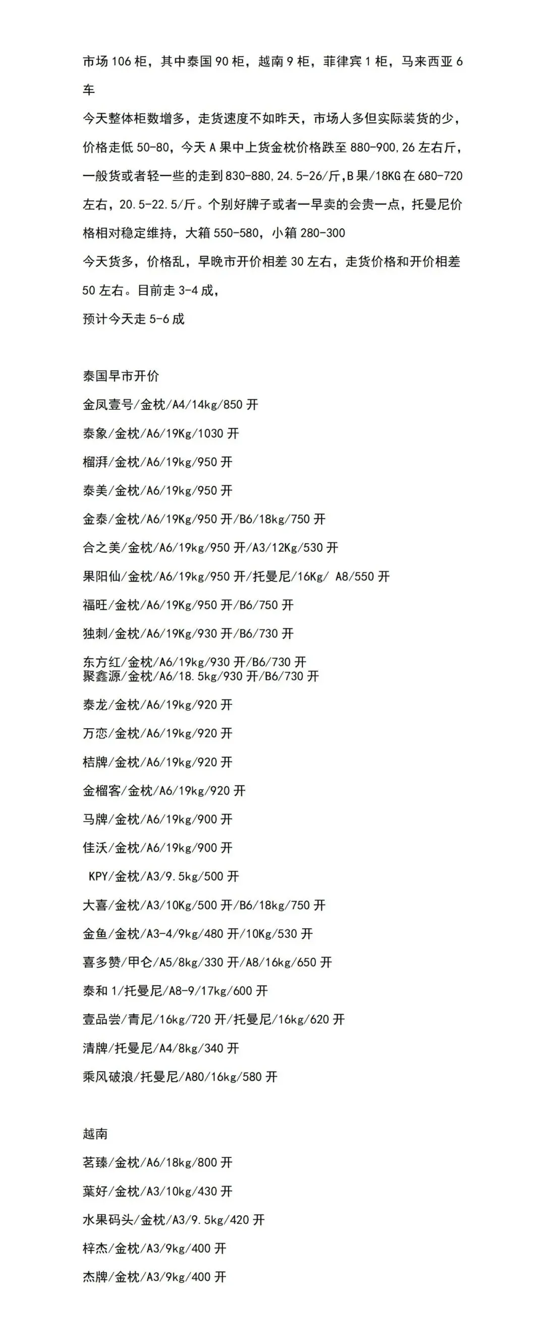 --新柜19条旧柜9条。日出货量7层左右。小品种产季即将结束。泰国金枕头陆续增量出货快,价格稳中偏弱。