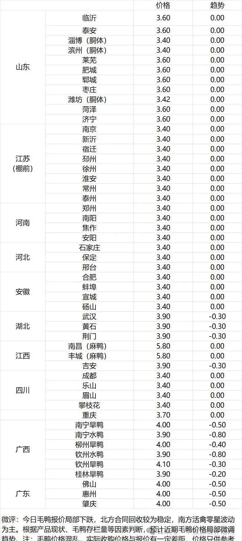 微评:鸭苗报价稳定。(注:南方只报当天价格)排苗节奏放缓,规模场补栏趋于理性。根据产品、养殖成本及鸭苗现状分析,预计近期鸭苗价格呈稳定为主趋势。种蛋报价稳定。温馨提示:该价格为主流厂家报价,实际销售价格以成交价格为准,价格仅供参考。