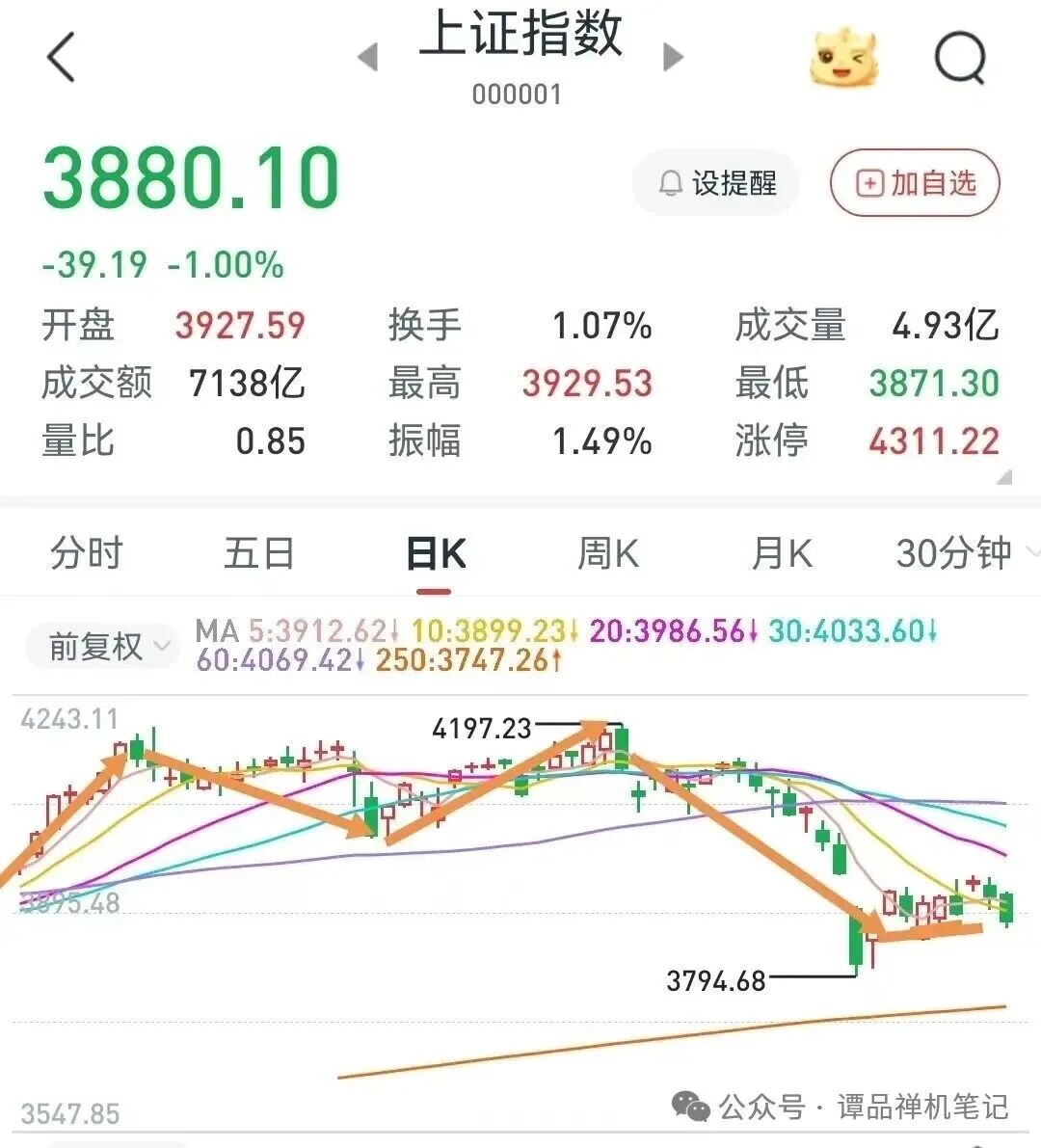 近期大盘行情走势分析预判回顾:2025年11月13日提醒阶段高点后市看跌,2025年12月17日看涨,提醒止跌反弹后市看涨。2026年1月中旬看回落,2月初看止跌反弹,3月3日看4197点是阶段高点,后市看回落,3月中旬谭品禅机反复提醒接下来会有大阴线,后大盘指数回落到3794点。3月底提醒下跌减缓看横盘,4月8日看中阳线提醒止跌反弹,4月9日看跌,4月10日看中阳,4月13日看涨,小至中涨。