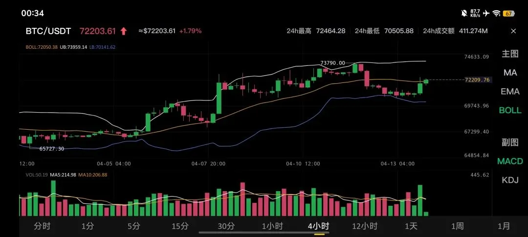 价格:72203美元,24小时+1.79%,恰好位于布林中轨(72050)附近,多空平衡点。