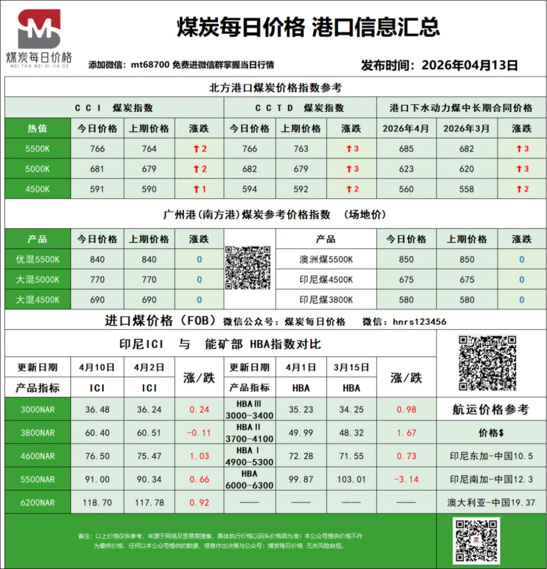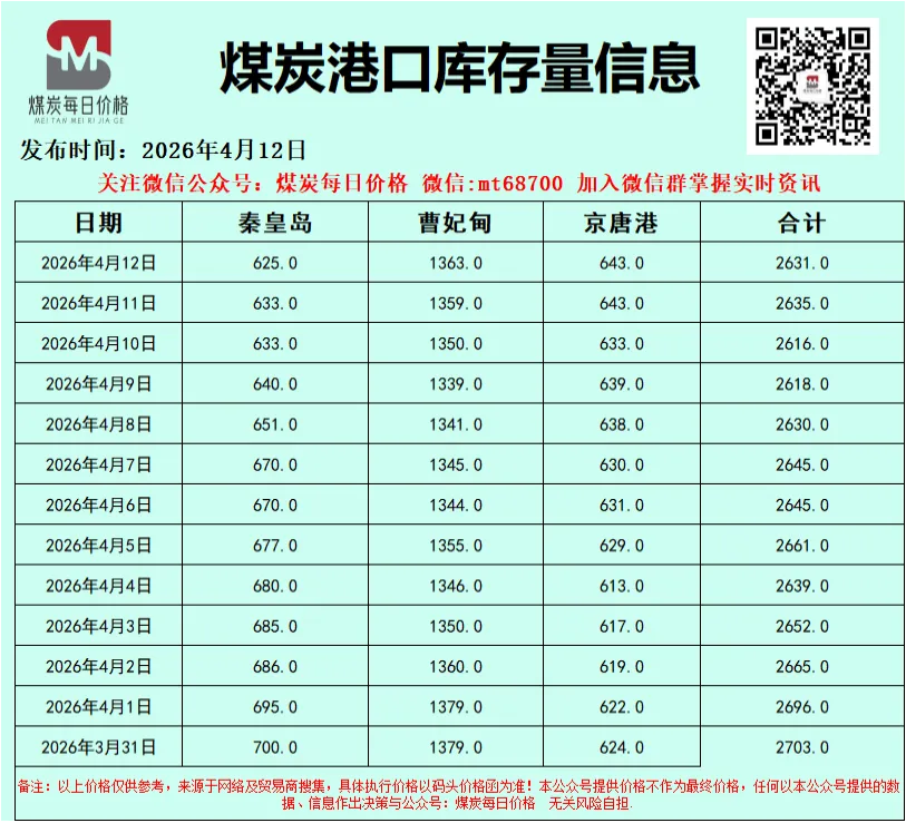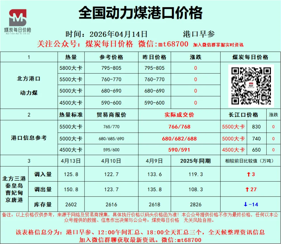 北方港口市场情绪整体平稳,但实际成交冷清,呈现“有价无市”的僵持局面。贸易商方面,挺价意愿较强,原因有二:一是大秦线春季检修导致港口煤炭调入量收紧,库存(特别是环渤海区域)缓慢下降,为煤价提供了底部支撑;二是进口煤价格高企,使得内贸市场煤在价格上仍有相对优势。然而,需求侧的疲软是当前市场的核心矛盾。终端电厂仍以长协拉运和采购低价进口煤为主,对市场煤的高价接受度极低,仅维持刚需采购。市场高价成交多为贸易商之间的投机性采购。以4月13日为例,5500K低硫煤报价在775-780元/吨,但实际下游还价仅在675-680元/吨,买卖双方价差巨大,难以形成有效成交。港口库存去化缓慢,叠加疏港压力,预计短期价格将维持高位震荡,难有突破性上涨。