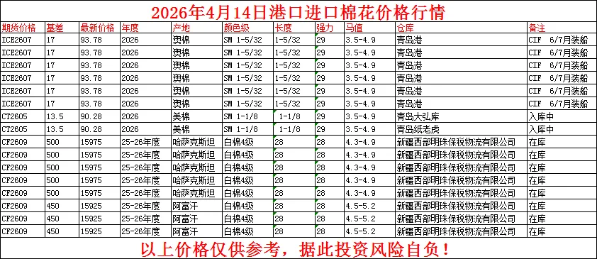据顺风棉花网sfmianhua.com棉花大数据中心最新监测显示,4月14日港口最新进口棉花价格行情。长期追踪棉花市场价格变动,欢迎关注我们。 顺风棉花网始创于2005年8月,是国内最早从事棉花信息咨询服务的专业平台之一。二十年来,我们始终致力于为产业链企业提供涵盖籽棉、皮棉、进口棉及棉花期货的全方位信息咨询服务,已成为业内信赖的专业信息机构。依托深厚的行业数据积淀与持续的研究,我们为棉纺企业提供精准、及时的《美棉每日报告》与《郑棉每日报告》,助力企业进行基差点价、期货套保、场外期权及生产经营决策,有效应对市场波动。【核心会员服务内容】每日棉花现货与期货价格基差数据最新皮棉行情与港口进口棉行情速递专业日报:美棉市场日报、郑棉市场日报深度行情动态与市场预测分析