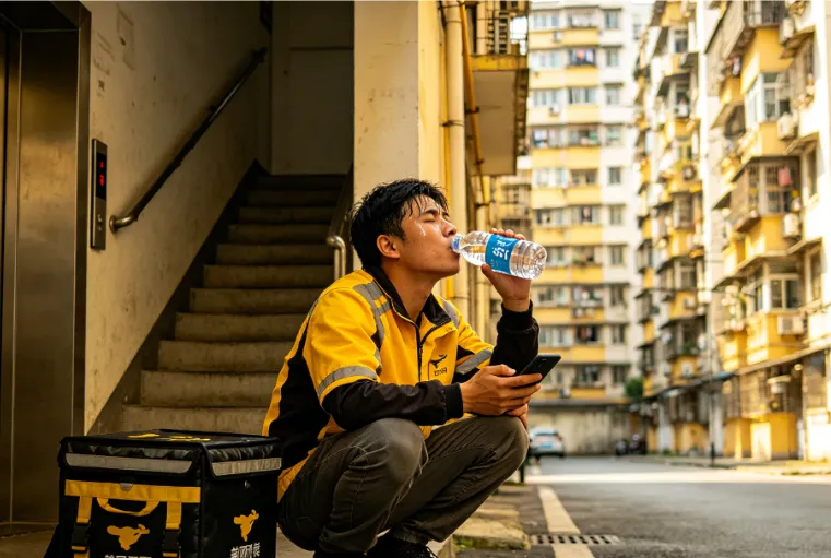 你可能好奇,一天都在干啥,简单说就是在车流里钻,在楼道里跑,在后台抢单,在商家等餐,在客户打电话,在地图上找路,在电梯口喘气,在楼梯间抬腿,在闷热里流汗,在冷风里哆嗦,在心里骂一句再忍一下,在表面笑一笑说马上到