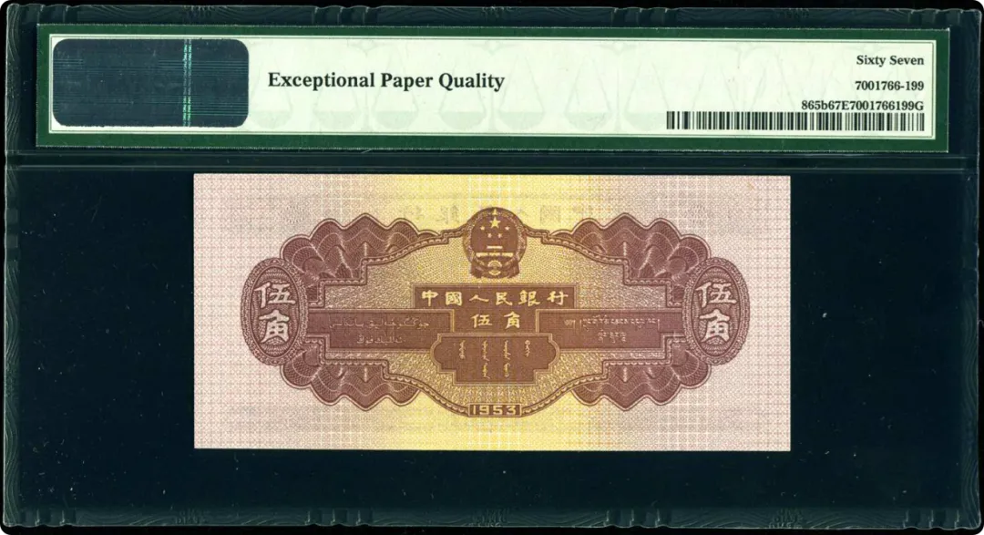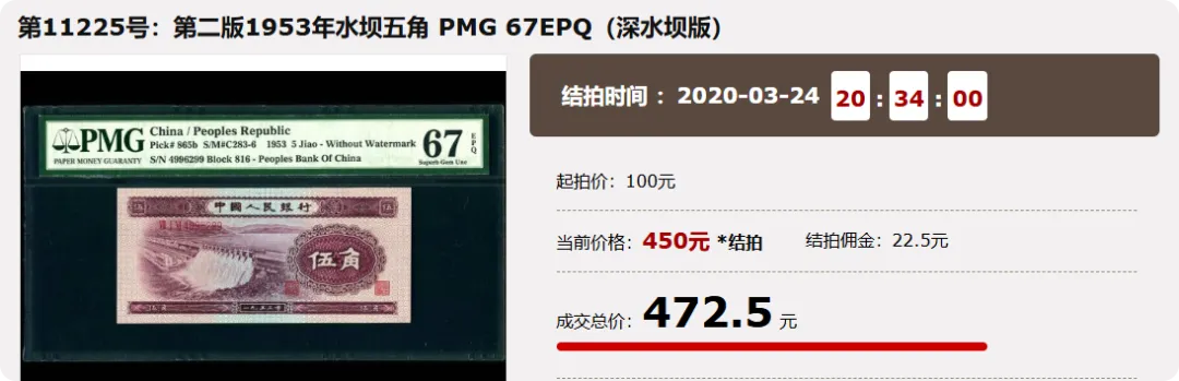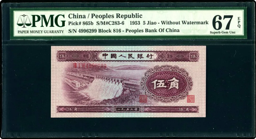 有过一次公开记录,PMG 67EPQ的深水坝五角,老盒,标有孙老师,472.5元,看到数字不急着下结论,深水坝的定价一直盯着浅水坝动,两个之间的差价浮着走,有时候翻倍,有时候二成,波动靠档期,哪阵子浅水坝出了68分,深水坝的67分就被压住,眼前这枚的老盒指纹印和磕碰,线下拿在手里没什么影响,线上被放大,买家就盯着图片,那个光斑在屏幕上像纸面的白点,心里会打个问号,472.5这个数字比估价下限高72.5,出价的人还是在,孙老师的名字起了一点作用,作用不大,深水坝五角不算他的主力方向,像是顺手送评,桥墩那块局部挂墨,67分的标准里不扣分,两个人同时看,一个当成版式细节,一个当成小瑕疵,心理价差能拉出一百,落在中间位置的成交,买家心态偏稳,拿得住,放得下。