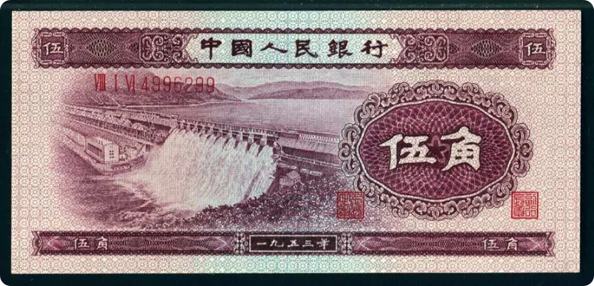 深水坝开始印的时候,水坝五角在柜台上已经过了几年,浅水坝的油墨发灰这个事,银行注意过,红一元那种褪色的程度没有,紫色放久了也会暗下去,旧新混在一起清点费眼神,后来配方换过一回,颜色调深,纸张厚一点,收藏圈把这版叫深水坝,厂里叫法简单,后期版,投放比浅水坝晚上几步,真正在市场上的时间反而短,第二版跟第三版交接,五角位子给了纺织五角,水坝五角退下去,深水坝从印出来到停用,掐指头四五年,磨损就下来了,高分比浅水坝多的原因在这,总量又少,起步晚,印得不多,这枚67分的正面最右侧桥墩,颜色深一块,像油墨在那儿多停了一下,局部挂墨这种情况,浅水坝少见,油墨稀,挂不住。