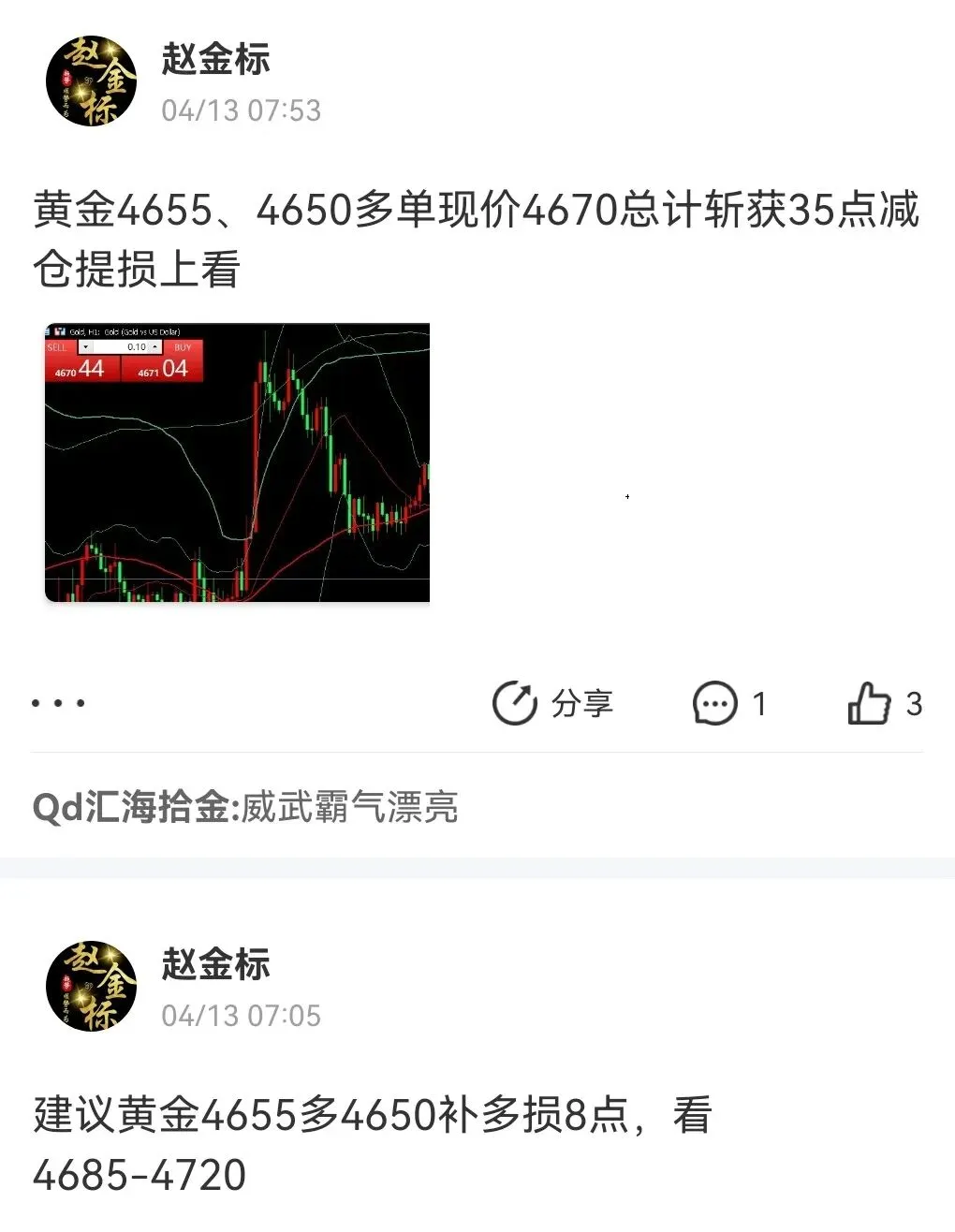 昨日操作回顾:上周末分析回踩做多,黄金在4655、4650多单在4670、4685减仓在4720总计获利135点出局;黄金4735空单在4720获利15点出局;黄金4740空单在4720获利20点出局;