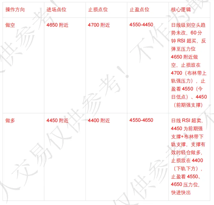 • 支撑压力:支撑位 4550(昨日低点)、4450(前期低点);压力位 4650(昨日开盘价、MA5 压力)、4700(布林带上轨)、4800(MA20 压力)。