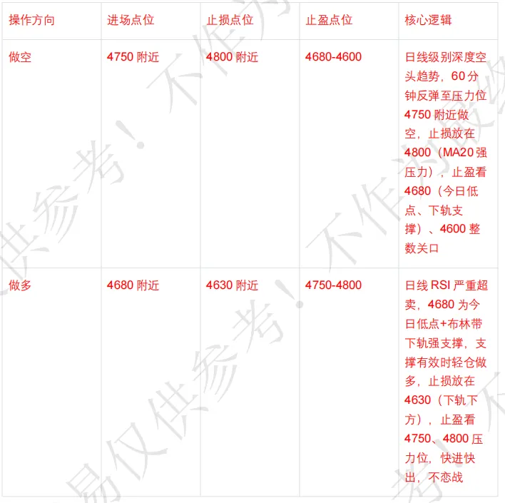 • 支撑压力:支撑位 4680(昨日低点、布林带下轨)、4600(整数关口);压力位 4750(MA5、MA10 压力)、4800(昨日开盘价、MA20 压力)、4900(布林带中轨压力)。