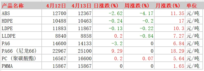 产品名称 | 4月12日 | 4月13日 | 日涨跌(%) | 周涨跌(%) | 月涨跌(%) | 单位 |
