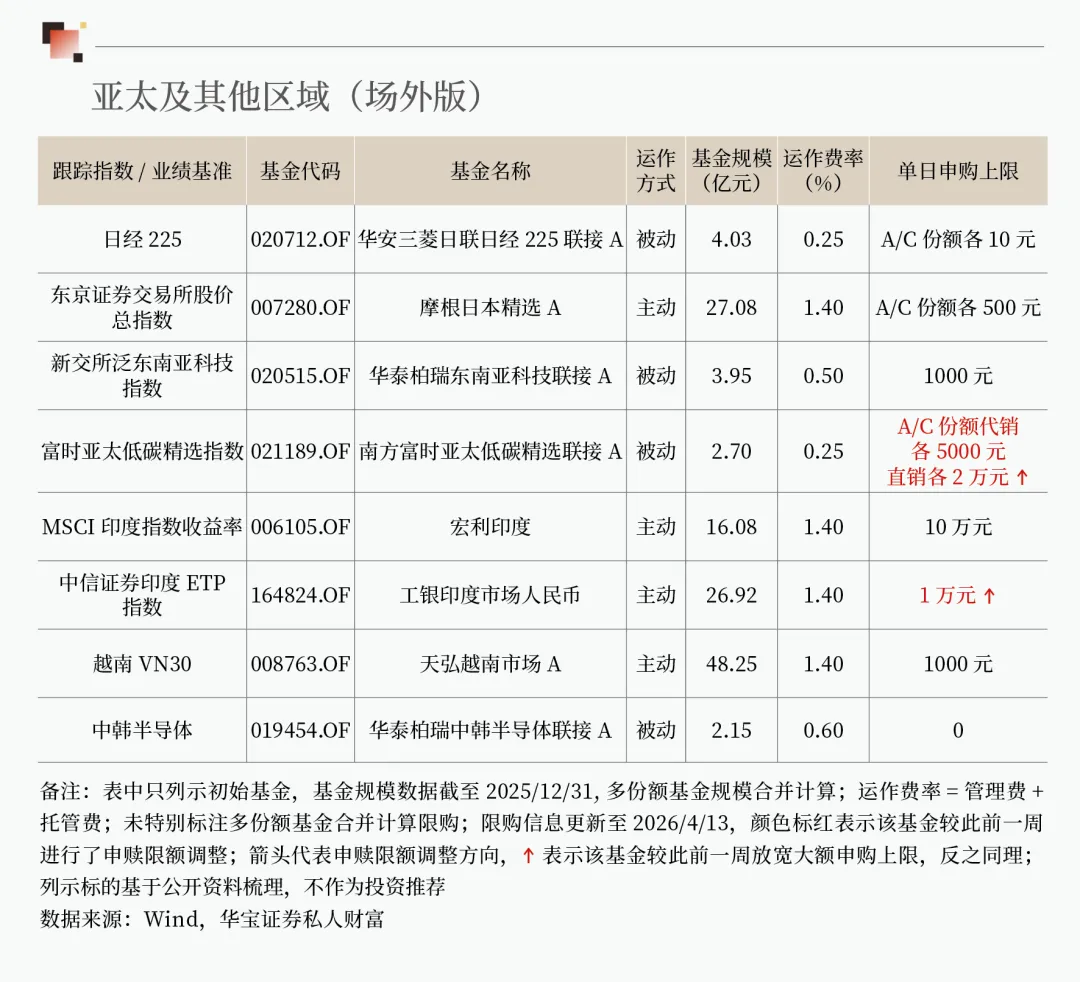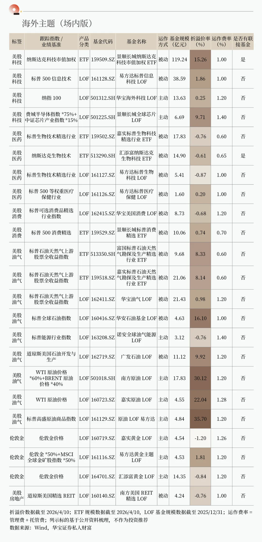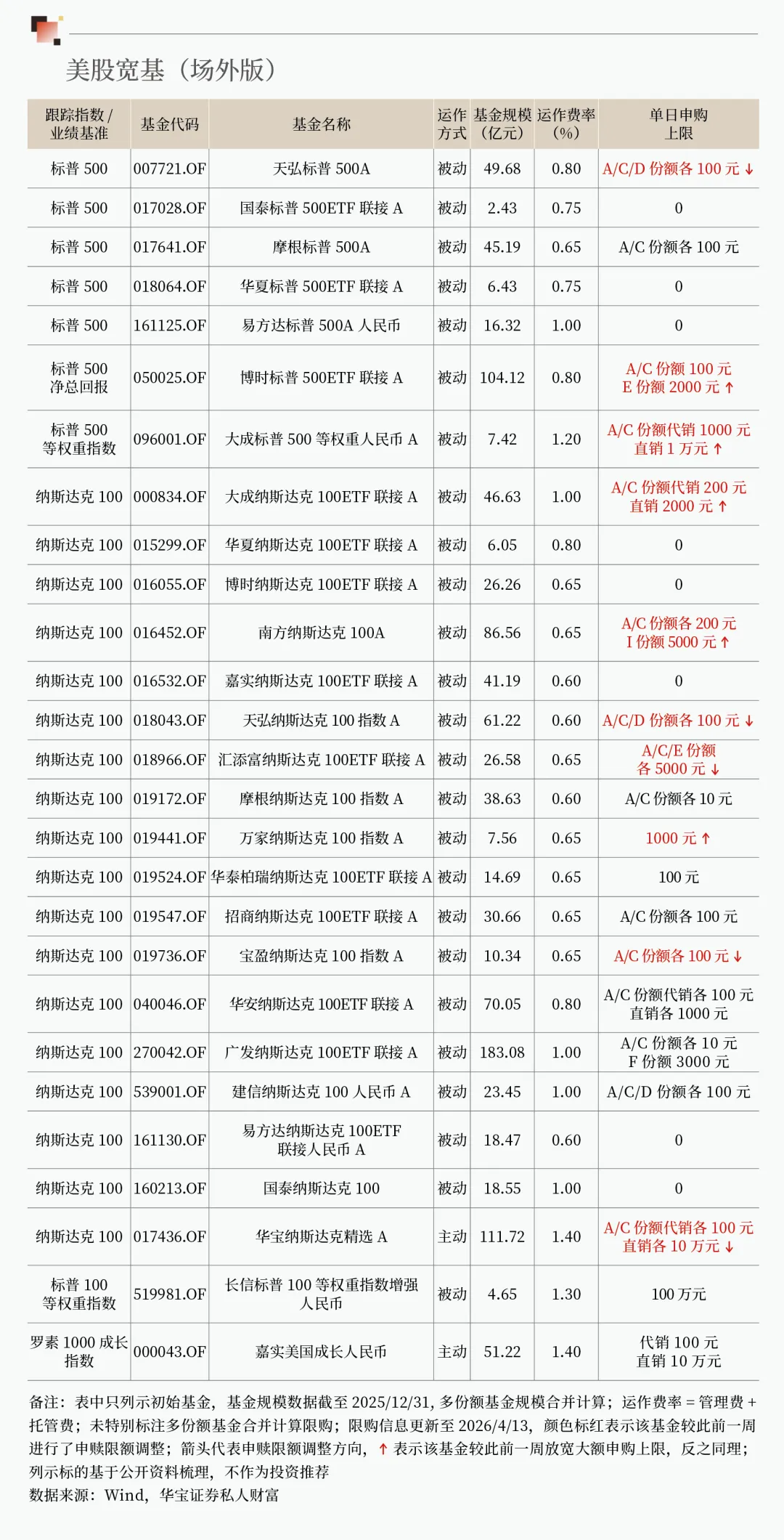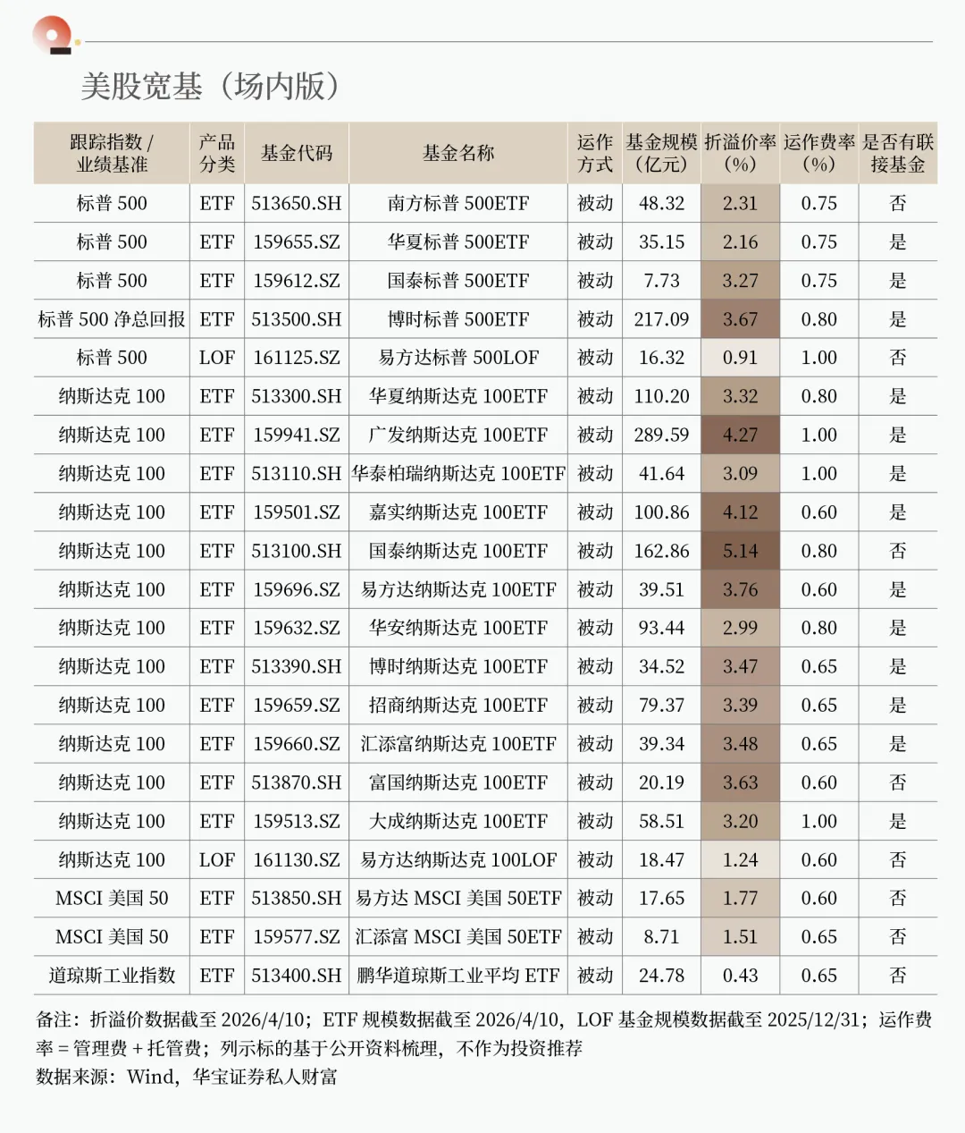 上周美股市场显著反弹,标普500指数全周上涨3.56%。市场情绪改善的核心动力在于美伊宣布开启谈判,地缘政治风险出现边际缓和,推动风险偏好快速修复,资金也相应回流权益资产。宏观层面,美国3月通胀数据呈现分化格局,虽然整体CPI在能源价格推动下同比上升3.3%,但核心通胀表现温和。背后反映出劳动力市场降温与消费需求平缓对物价的抑制作用,也意味着近期油价上涨更多带来结构性通胀,而非全面性价格压力。本周,除了继续跟进美伊谈判进展,市场焦点也逐步转向财报季,本周阿斯麦、台积电等科技企业将发布财报。操作层面,对美股资产仍可考虑逢低逐步增配。上周,场内QDII基金的整体溢价率小幅回升。美股宽基产品中,多数标普500和纳斯达克100ETF的溢价率来到2%-4%区间。海外主题类产品溢价水平涨跌互现,科技类产品溢价维持高位,油气类基金溢价则大幅回落。场外方面,近期放宽限购的QDII基金明显增多。例如,上周博时、大成、南方、万家等基金公司陆续适当放宽美股宽基类产品的单日申购限额。此外,也有产品在短暂放宽后再次收紧,例如天弘、汇添富、宝盈旗下美股宽基产品限购额度均有下调。一起来看看最新的QDII基金折溢价情况与场外限购动态吧!