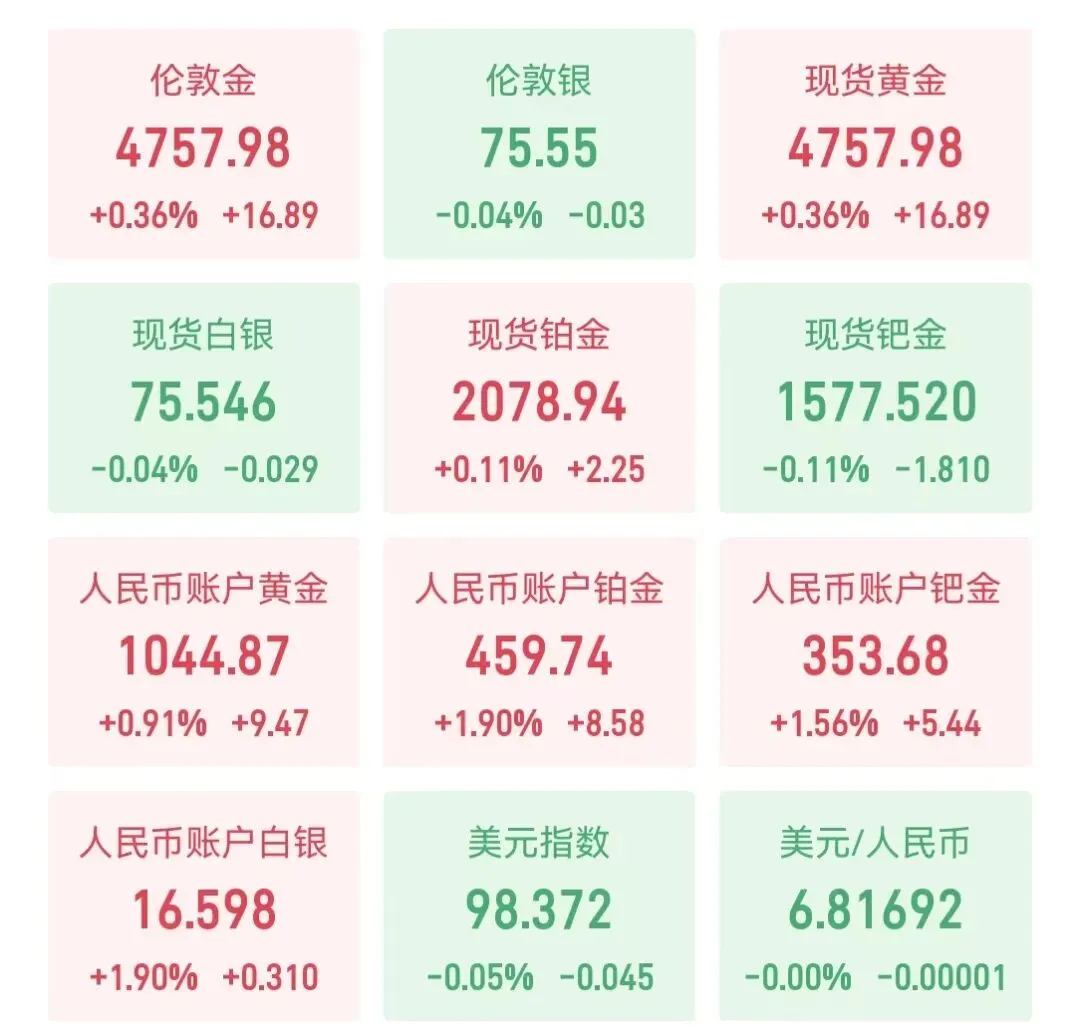 伦敦金现:约4757美元/盎司,自昨日低位反弹