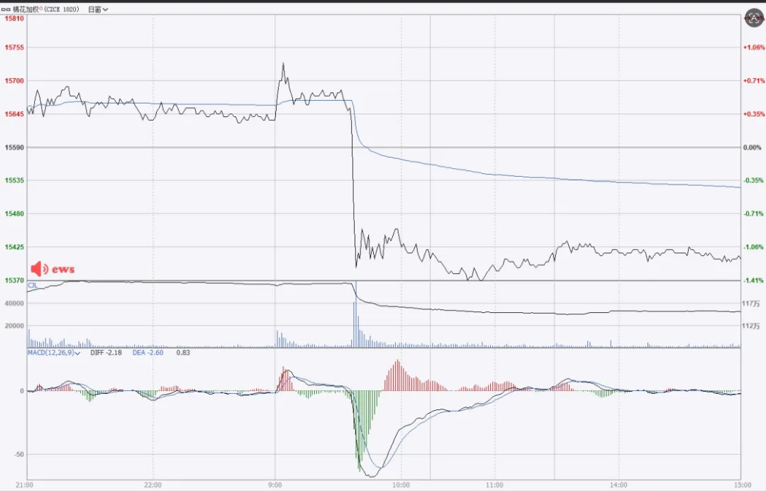 1.价格走势:早盘维持15640-15700 区间震荡,9:30左右出现闪崩式跳水,从 15680附近快速下探至15400下方,最大跌幅超1.4%;午后在15400-15430区间弱势震荡,全天呈现“冲高—暴跌—低位盘整”的极端走势。2.成交量:跳水时段成交量急剧放大,出现明显放量杀跌,后续成交量逐步萎缩,市场情绪快速降温。3.技术指标(MACD):跳水后DIFF与DEA快速下探至零轴下方,形成死叉,绿柱大幅放大,空头力量集中释放;午后绿柱逐步收窄,空头动能有所衰减,但整体仍处于弱势区间。4.关键信号:日内价格跌破15600关键支撑位,技术形态走坏,短期趋势由震荡转弱。(二)棉花VIX指数日盘走势