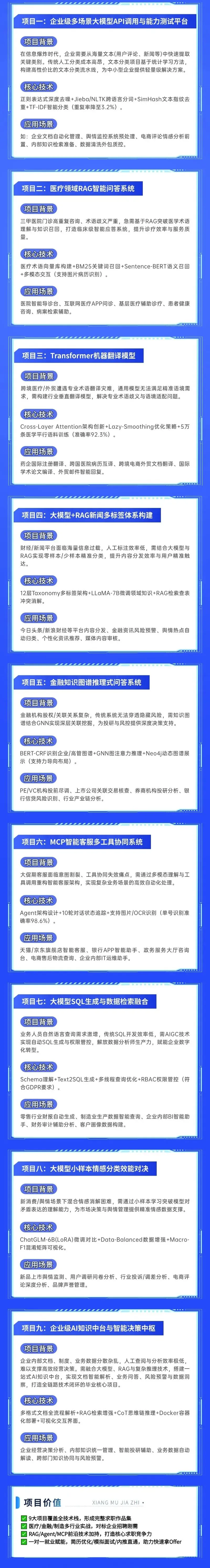 课程体系包含了Ai领域核心项目及前沿项目,覆盖非常全面,适用于所有行业的算法岗位,整个课程更注重带领学生项目实操和落地,授人以鱼不如授人以渔,学完后还会具备举一反三的能力,无论进入什么行业,算法岗位和项目均能胜任。