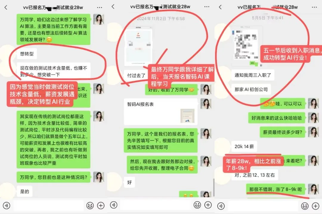 刘同学大专毕业,做了5年软件开发。考虑到当下开发岗位很卷,而且自己的学历和工作经验都不占优势,所以想通过AI技术能力加持跳槽实现涨薪。在系统性学习后斩获23k、28k两个offer!02从测试转型AI,斩获28w offer! @ 万同学