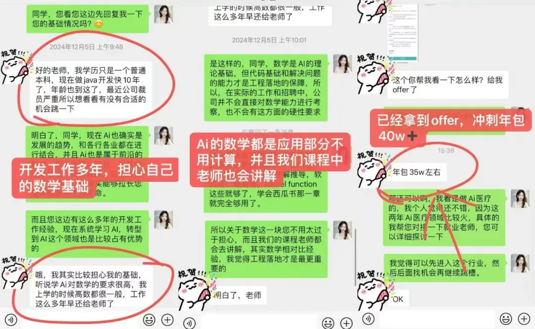 陈同学是有近10年经验的软件开发,近期业务不稳裁员频发,所以考虑跳槽。了解到近期AI方向的岗位年包比较高,很心动,但又觉得自己的基础一般,担心学不好。纠结很久最终还是选择了报名,经过3个月左右的学习,最终拿到了年包40w+的offer!咨询更多课程信息
