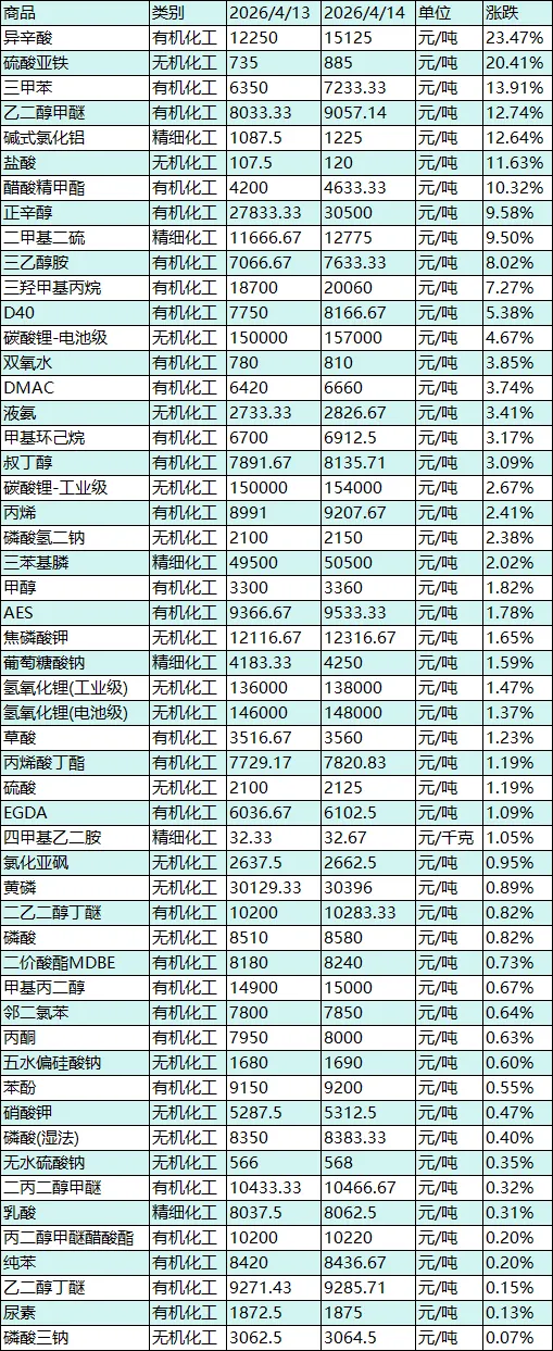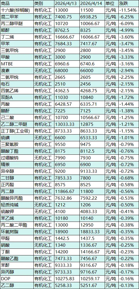 - 核心驱动明确,涨跌逻辑闭环:今日市场涨跌的核心是“春季环保整治深化+下游细分领域需求爆发+部分品种供应收紧”的上涨因素,与“美伊停火带动原油及棕榈油价格回落+芳烃及部分有机品种供需宽松”的回调因素共同作用。异辛酸、硫酸亚铁等极端上涨品种,核心得益于供应收紧与下游需求爆发的双重驱动;三甲苯、乙二醇甲醚等品种的上涨,依托环保管控与成本传导;十六酸的极端回调,直接受上游棕榈油价格大幅下跌带动;混二甲苯、丙二醇甲醚等芳烃、醚类品种的回调,源于原料价格回落与供需宽松;整体定价逻辑贴合化工行业基本面博弈的中期特征,兼顾原料联动、环保、供应、需求等多重因素,展现出“两极分化加剧、局部高景气延续”的运行态势。