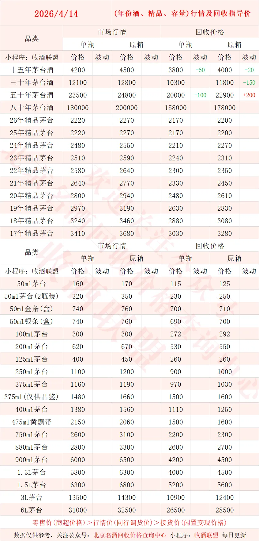 以下内容为,本公众号每日会及时更新的飞天茅台、生肖茅台、年份茅台,陈年茅台及不同毫升容量茅台的市场行情和回收报价;还包含五粮液、汾酒、剑南春、泸州老窖等国产名酒的行情及回收价,法国拉菲、木桐、玛歌等名庄红酒的回收报价,轩尼诗、马爹利、人头马等世界知名洋酒威士忌的回收参考价,每日整理不易,请点击关注支持。▪畅销类茅台行情及接货参考价▪