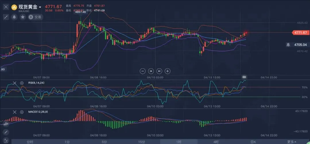昨日(4月13日)黄金上演"深V"行情:受美伊谈判破裂冲击,现货黄金早盘最低触及4,635美元一线,盘中自低位反弹约110美元,最终小幅收跌于4,740美元附近,日线收出长下影线的探底形态。进入今日亚洲时段,金价延续隔夜反弹,早盘一度冲高至4,765美元上方。