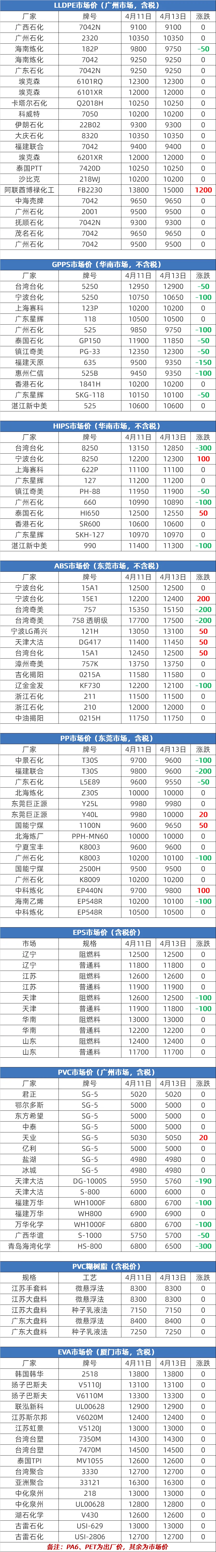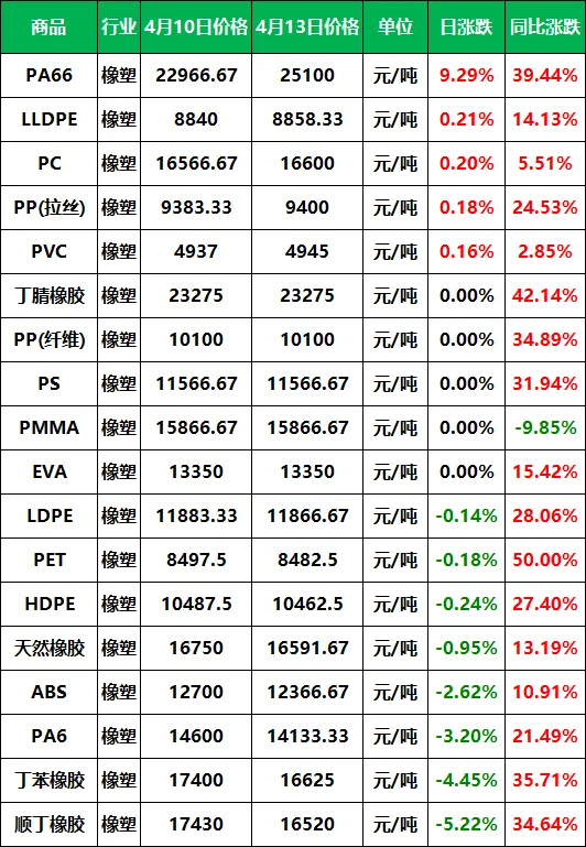2026年4月13日大宗商品价格涨跌榜中橡塑板块环比上升的商品共5种,其中涨幅5%以上的商品共1种,占该板块被监测商品数的5.6%;涨幅前3的商品分别为PA66(9.29%)、LLDPE(0.21%)、PC(0.20%)。