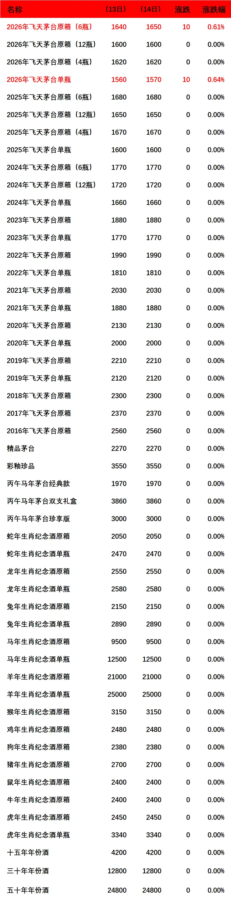 2026年飞天茅台原箱(6瓶)和单瓶上涨。