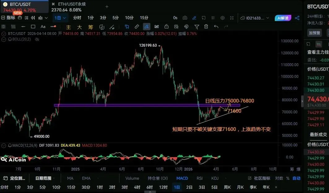 大饼行情分析:日线当前价格处于上升趋势线上方,短期上涨趋势明确,当前在日线压力区75000-76800下方蓄力。指标MACD在零轴上方金叉,红柱持续放量,多头动能强劲;只要不破71600支撑,上涨趋势不变;若放量突破75000压力,将打开更大上行空间,挑战前高76800;若跌破71600,趋势转空,下探70000。