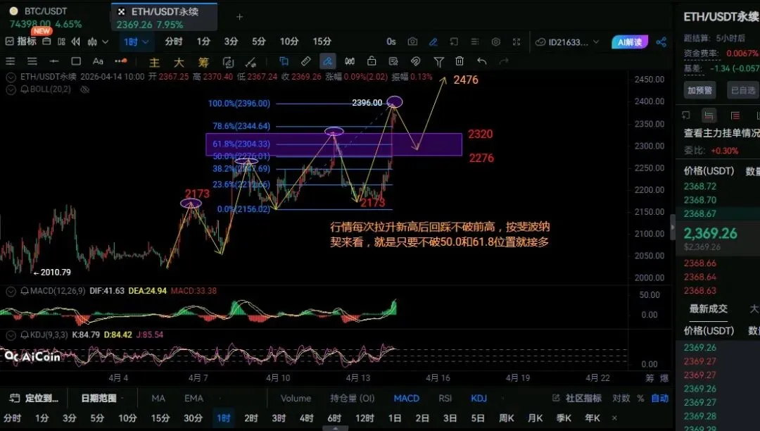 以太行情分析:1小时当前走势斐波那契结构,行情每次拉升新高后回踩不破前高,只要不破50.0%(2276)和61.8%(2320)位置,上涨趋势不变,当前处于多头强势阶段。若回踩破位2320-2276支撑,趋势转弱。