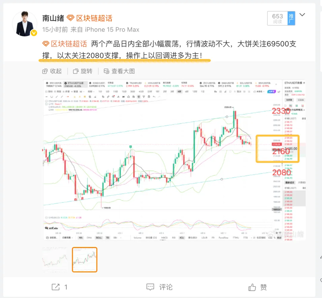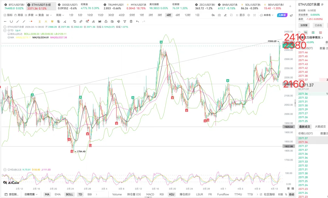 以太昨日盘中分析下方支撑位在2160附近,昨晚在2180附近做多,目前最高涨至2396,做多获利将近220点利润,日内操作继续维持区间2160-2380操作。