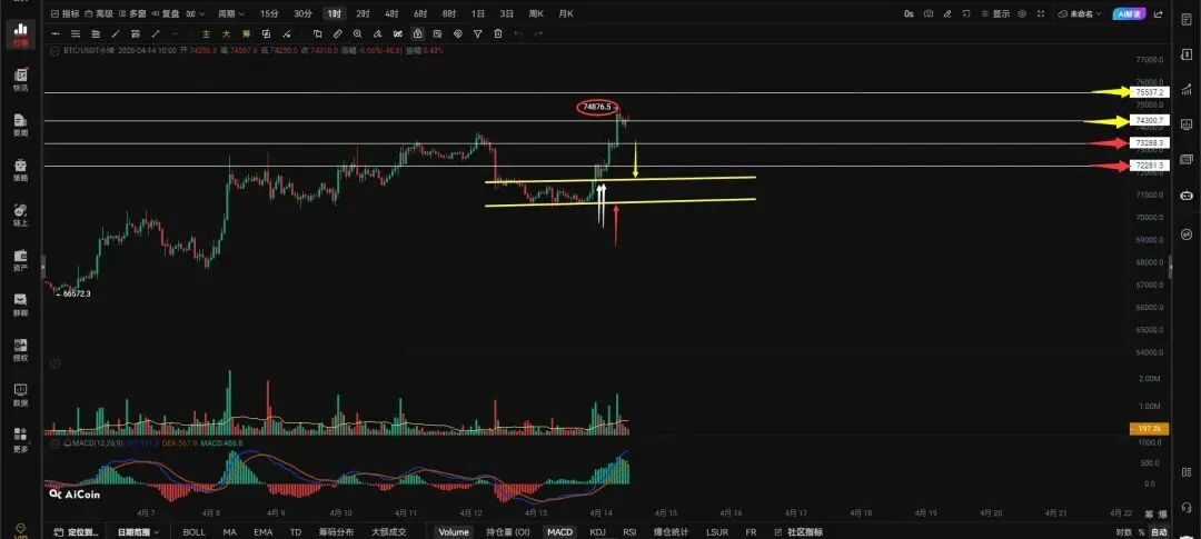 大饼在旗形内部盘整了3天最后选择了向上突破,并且再次创出新的高点,不知道各位同学你是否有做多,还是你的老师在一直让你做空一直在扛单。大饼在突破旗形之后喜欢做右侧交易的同学就可以多进去了,因为大饼已经突破了旗形创出了新的高点,我就是在大饼突破旗形之后和我的同学右侧追的多。稳健型的同学你可以等回踩,大饼在突破旗形之后有两次回踩旗形上边界的动作白色箭头所指,回踩也给到你了你还不多那真是没招了。突破给了回踩也给了你都不多给你机会你不中用啊!随后开始阶梯式拉盘让你想追车你都追不上,当下的大饼只要能保持在74300上方运行大饼的下一个目前位置就是75537附近,别总有价格涨了这么多是不是该空了的想法,认清趋势很重要。你想做空多头趋势可能刚刚开始你做空只有两个结果第一被打止损,第二爆仓,你能接受你可以空,接受不了不如顺势而为。大饼为什么涨的这么猛,就是因为外面全是空军不给空军彻底打败,让空头转换成多头大饼怎么能掉头?大饼不能保持在74300上方运行就会去回踩下方的73288的支撑,能撑住走74300-73288的震荡,撑不住继续向下回踩72281和旗形上边界都是没毛病的。只要不重新跌回旗形内部运行,都是正常回踩。