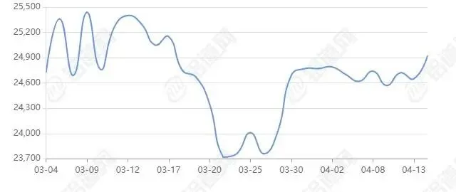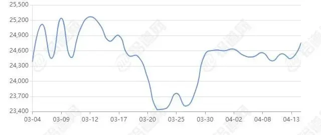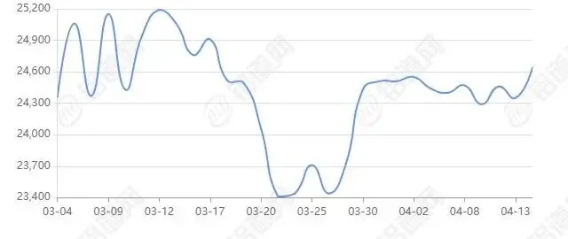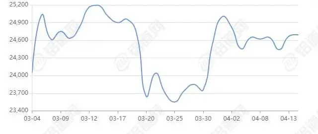 2026年04月14日上海期货行情价24690涨跌+100,最低24690,最高25040,前三日均价24583,前五日均价24603。
