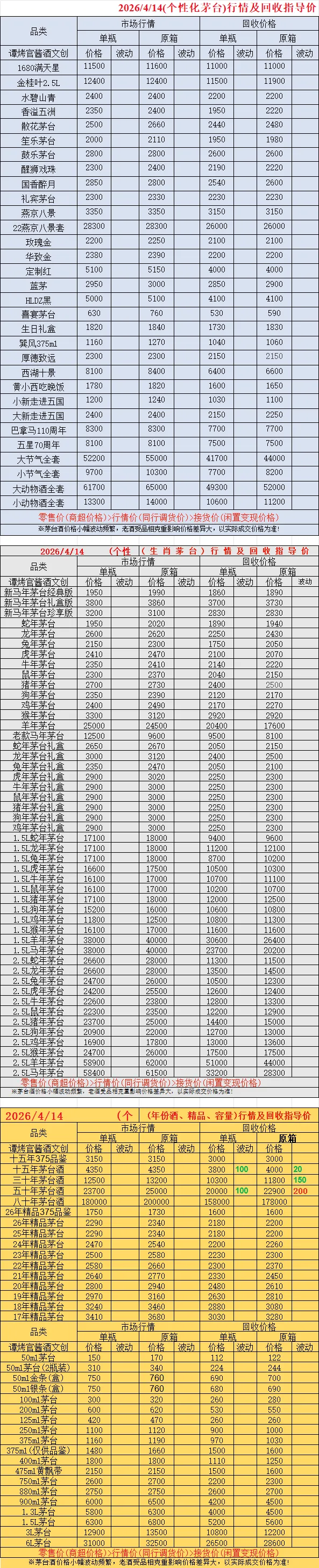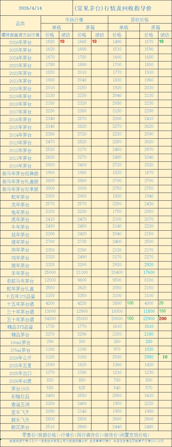 今天是2026年4月14日星期二,与昨日行情相比:常规茅台中:2026年飞天原箱6瓶装,2026年飞天散瓶上涨,回收参考价常规茅台中:2026年原箱飞天跌价,2026年公斤茅台原箱涨价,年份茅台中:15年原箱和散瓶、三十年原箱、五十年散瓶跌价,五十年原箱涨价