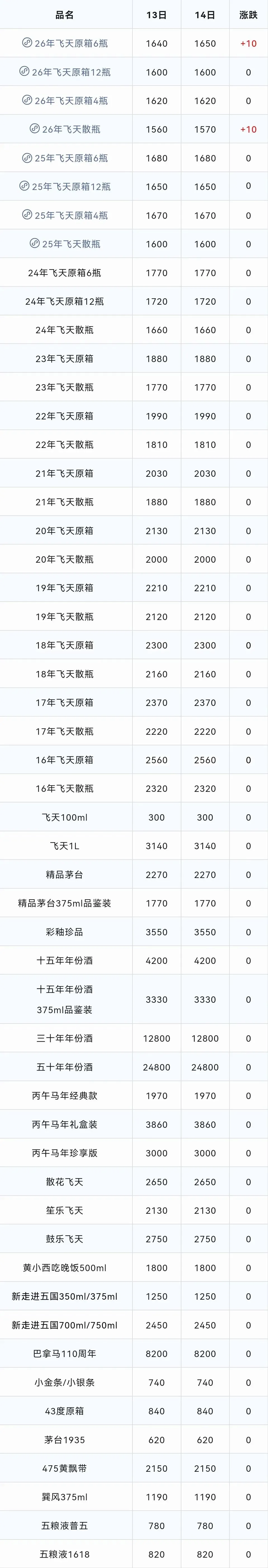 常规茅台中:2026年飞天原箱6瓶装,2026年飞天散瓶上涨。