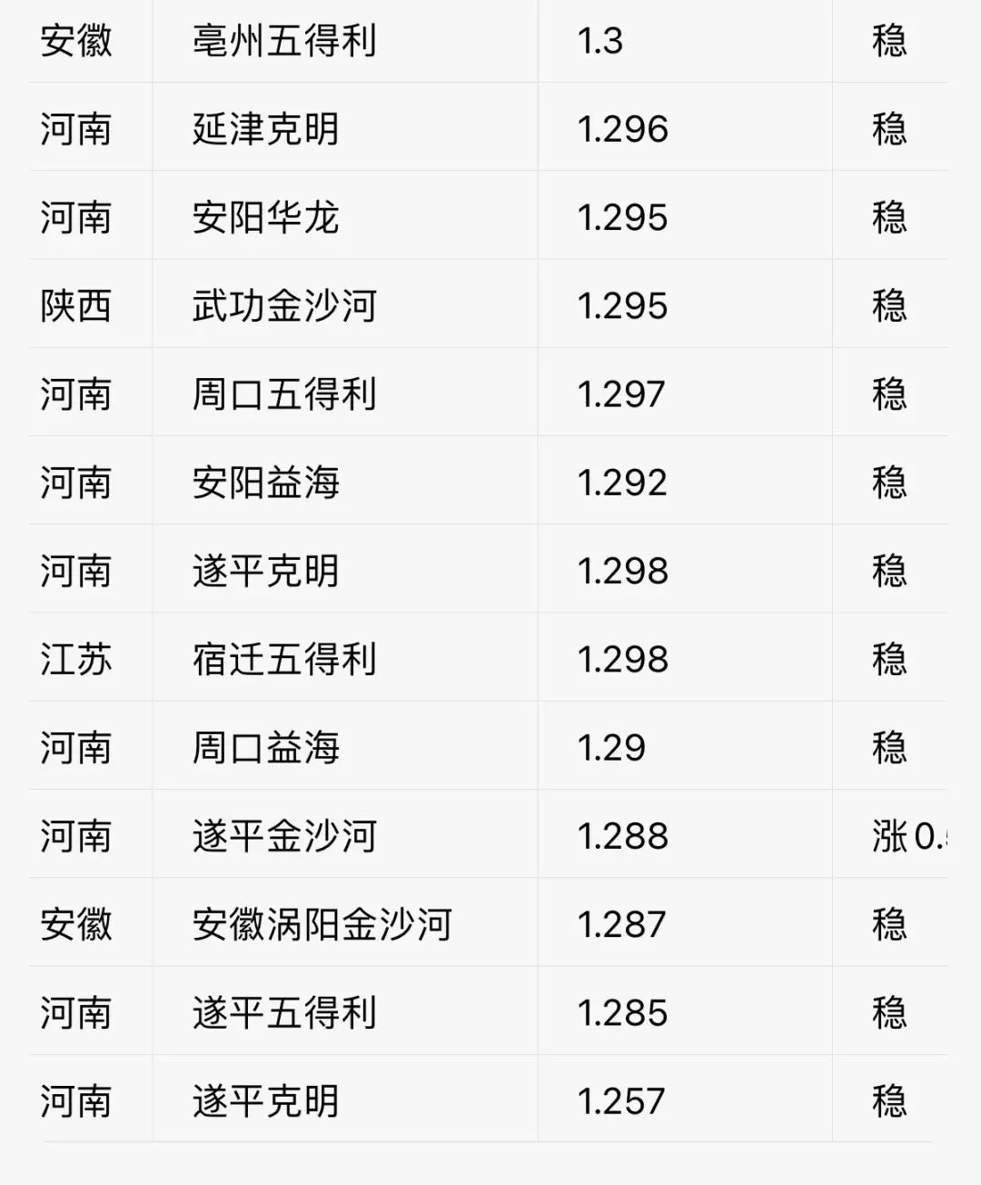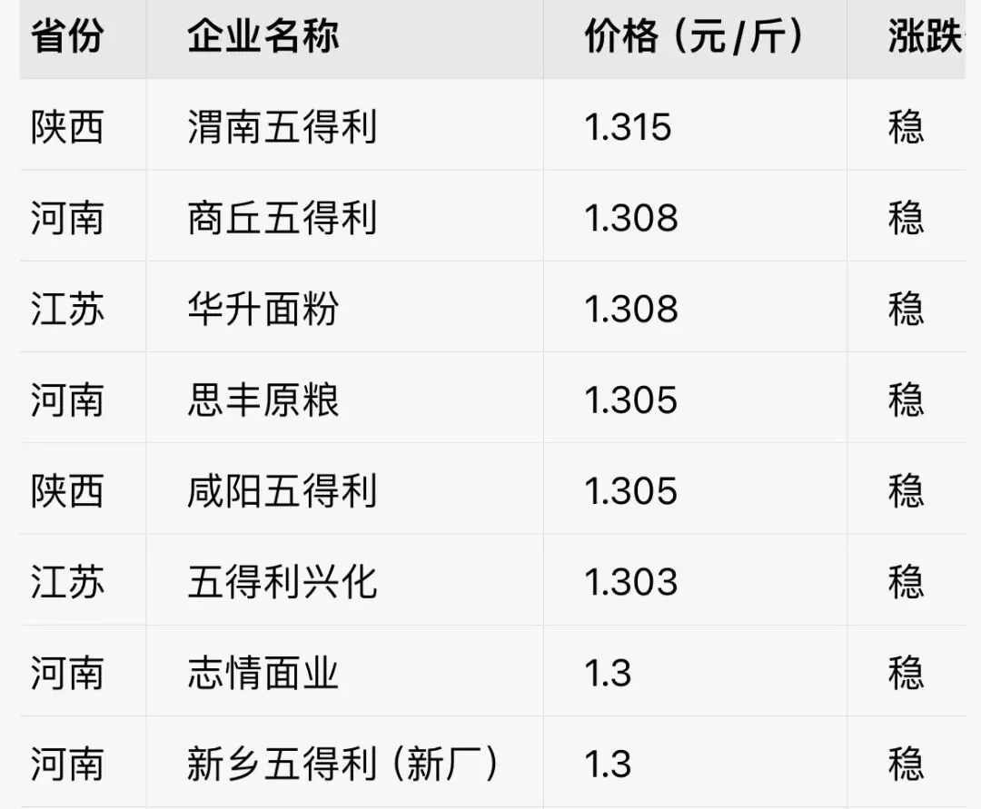 · 普麦:山东(1.30-1.315元/斤)、河南(1.29-1.31元/斤)、河北(约1.295-1.30元/斤)。其中山东、河南到厂价近一周微涨1元/吨,河北主流面企多数挂牌价平稳。