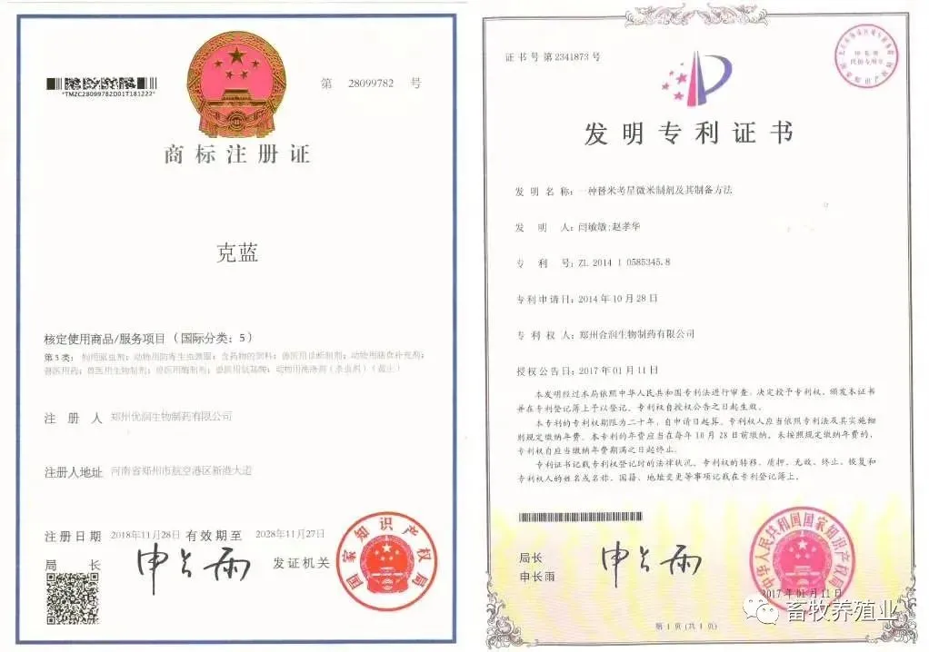 (1)研究历程:克蓝是畅销产品从08年开始就已经使用,历经十多年年逐步完善,2016年初上报农业部门经过一年的论证研究证实,证明克蓝套餐,针对蓝耳,圆环,副猪,支原体,链球菌,具有很好的净化治疗效果,最后颁发克蓝套餐专利证书让更多养殖朋友信任产品,并且名字申请了商标证书,是具有唯一性,专属优润集团专用。下图是产品专利证书,商标注册证书