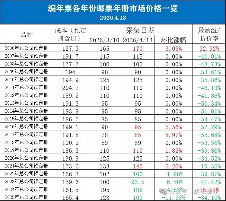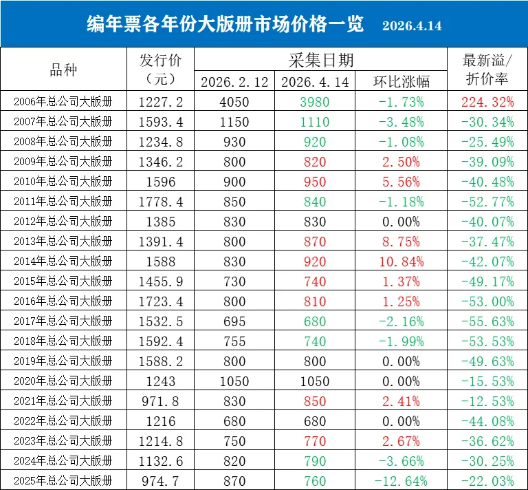 下涨的8个品种中,2025年大版册以12.64%的跌幅居首;2024年大版册和2007年大版册分别以3.66%和3.48%的跌幅排在第二、二名;另外5个年份大版册的跌幅都不到2%。