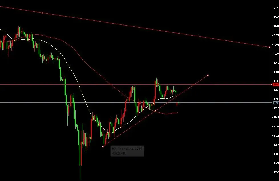 关键防线(中期支撑):4680-4650 ,4 月多次测试未破的密集成交区,若失守或打开下探 4600 空间。