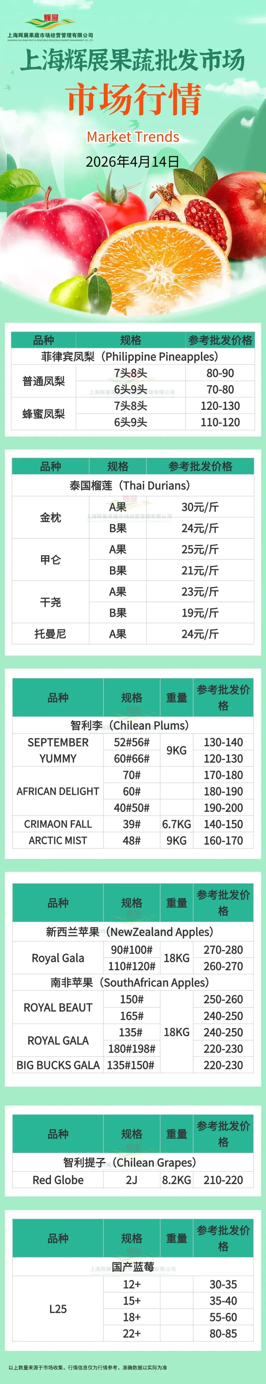 4月14日上海辉展果蔬批发市场行情 |智利提子、南非苹果、国产蓝莓、泰国榴莲等