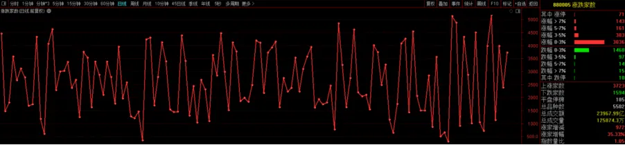 上涨家数3723家,下跌家数为1594家,上涨家数偏多一点。