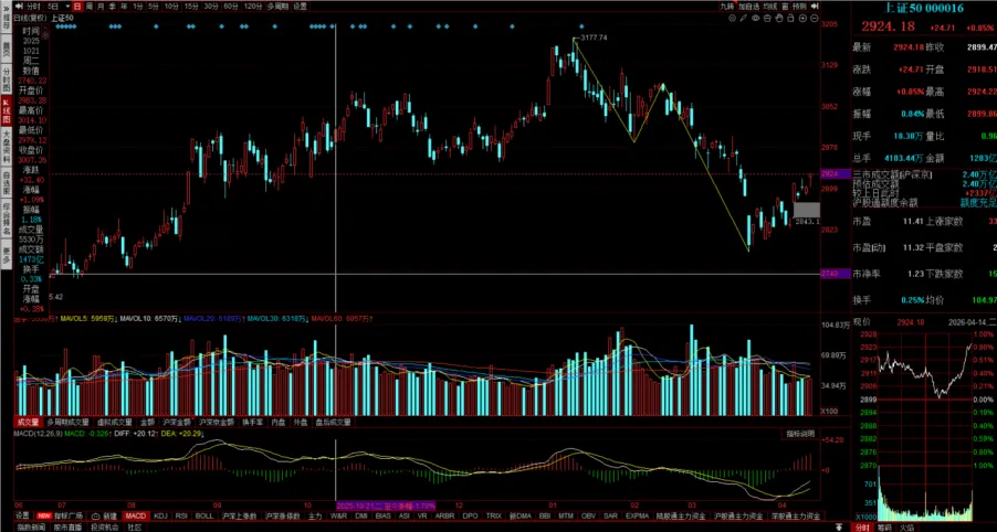 今天缩量上涨0.85%,下影线比较长,是光头阳线,明天按惯性应该还会再冲。
