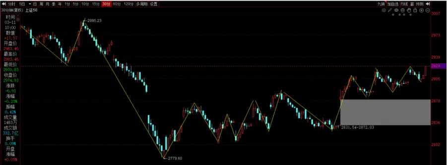 30 分钟级别上,表现为中枢震荡,目前在走向上一笔中。