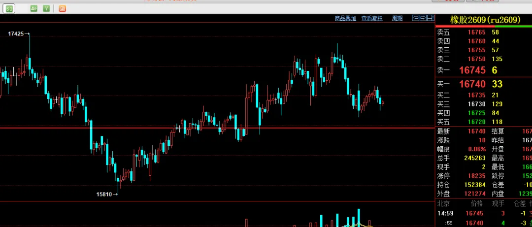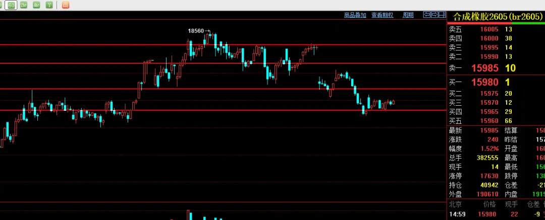 目前铁矿整体低位震荡看待。支撑750关口企稳到下方745附近不跌破企稳建议试试多单的反弹,上方压力770突破站稳则也继续看多为主,建议暂时低多。2605合成橡胶小时线;目前区间震荡偏多看待。