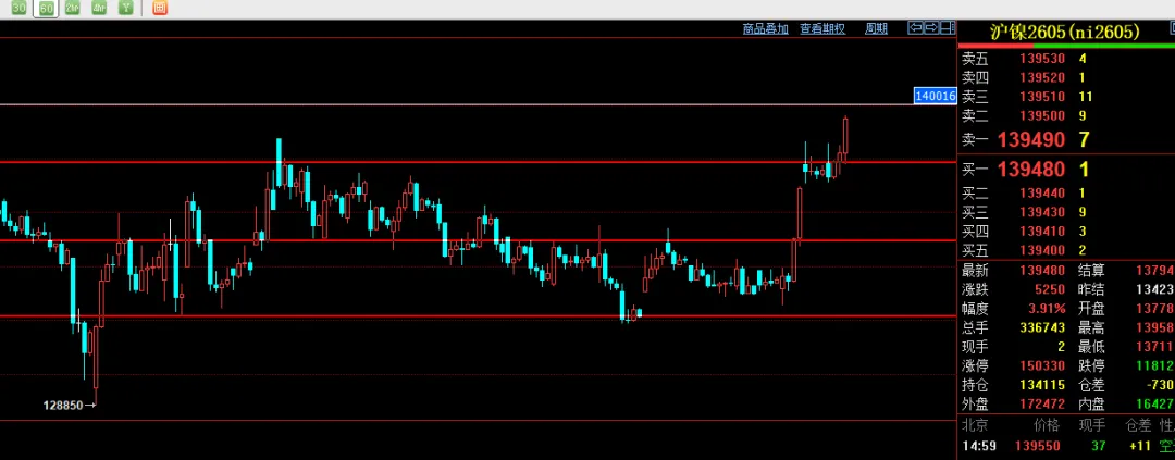 橡胶暂时还是区间震荡看待,上方关注压力17300整数关口突破则继续看多。遇阻可以试试回调,下方支撑16700到16500不跌破还是建议回调企稳多单思路,整体建议区间内低多为主还是震荡。2605沪镍小时线;目前箱体震荡看待。