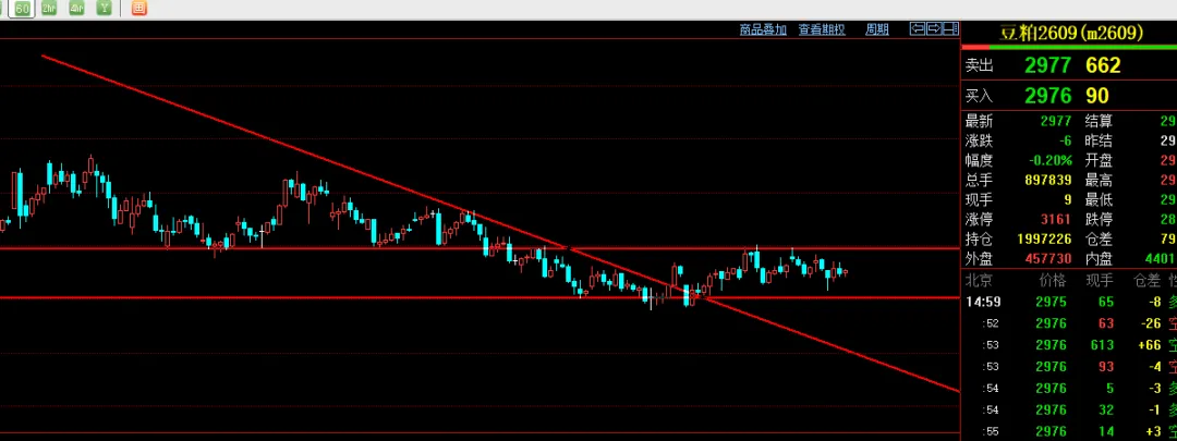 目前合成橡胶震荡还是偏多看待暂时15500可以看作多空分界线,等下方的回调15600到15800附近企稳也可以继续尝试反弹,激进的15800附近也可以继续参与多单。目前建议不跌破15500继续回调低多为主,2609豆粕小时线;目前震荡偏多看待。