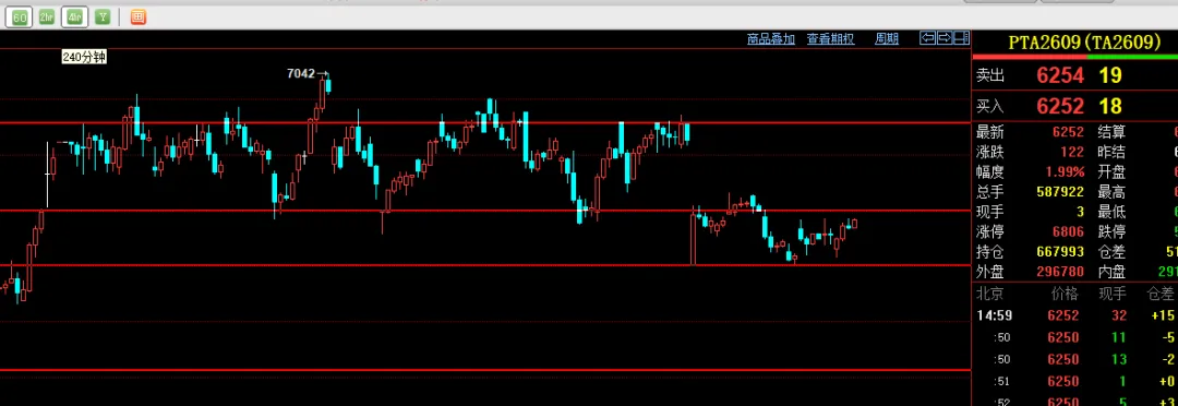 目前豆粕2950暂时可以看多空分界线,下方支撑2960到2940附近关注支撑企稳试试多单整体震荡偏多。激进的回到2970附近企稳也可以参与多单,上方压力3000突破则继续看多。2609PTA小时线;短线来看目前震荡偏多看待。