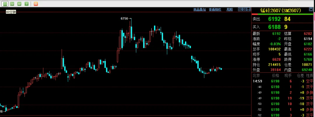 目前油脂整体还是地位震荡偏多看待,下方再次回调到9400到9430附近回调企稳再次尝试多单,稳健的等9370附近可以回调企稳再次试试反弹,目前建议低多为主。上方压力9700突破站稳则也继续偏多看待。2607锰硅小时线;目前偏多看待。