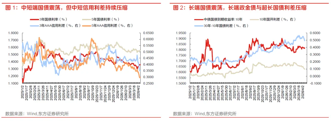 近期债市表现出明显的利差压缩行情。一方面,无论是长端10年期国债利率,还是3-5年中短端国债利率,都结束了春节前的持续修复下行,转为震荡行情;另一方面,无论是中短信用利差,还是长端政金债与国债利差,都出现了持续压缩,甚至于超长期国债,其与10年国债利差在经历了持续走阔后,进入4月后也出现利差压缩行情。