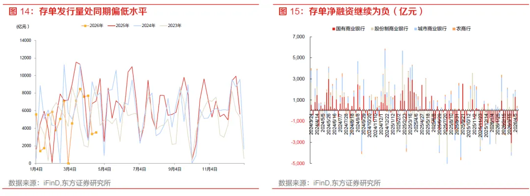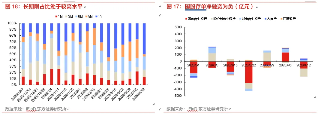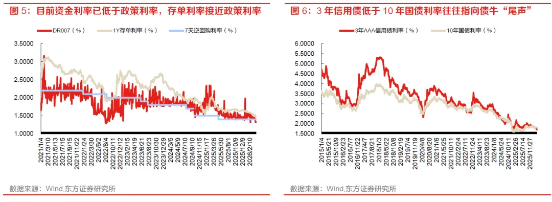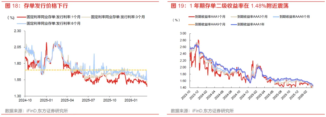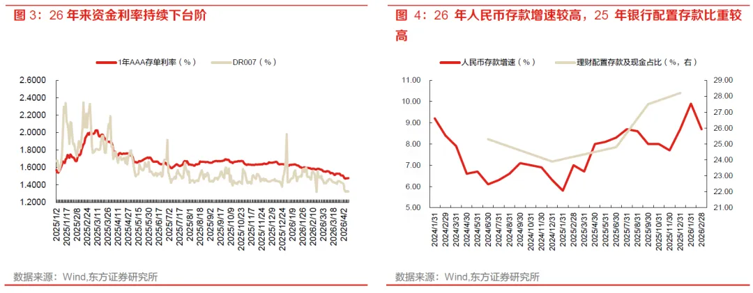 我们认为该利差压缩行情源于资金驱动。一方面,市场对宏观基本面的预期并未恶化,再加上地缘政治因素导致的全球通胀担忧升温,投资者对于利率能否继续下行存疑,特别是对于银行、保险等自营投资者来说更是如此,因此10年内期限国债利率继续下行受阻。另一方面,资金持续宽松,表现在两个维度:一是资金利率持续走低,4月以来1年期存单利率跌破1.5%,DR007不断向1.3%靠拢。资金利率走低打开了套息空间,有利于利差压缩策略。二是26年以来存款增速相较25年有所反弹且超出市场预期,银行资金较为充裕,即使同业存款有流失依然不存在流动性缺口;理财25年以来配置存款及现金比重显著提升,在同业存款监管加码后,这部分配置压力转向债券,并向债券基金传递,增加市场做平利差的动力。