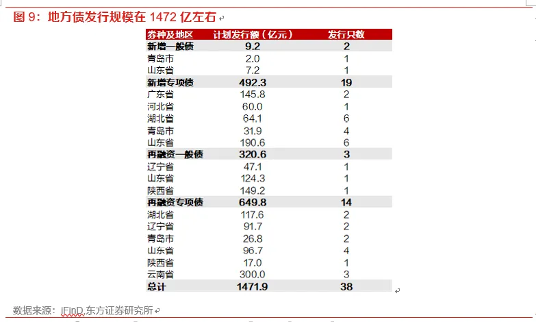 (2)地方债:本周计划发行38只地方债,发行规模1472亿;其中新增一般债2只(规模9亿),新增专项债19只(规模492亿)、再融资一般债3只(规模321亿)、再融资专项债14只(规模650亿)。
